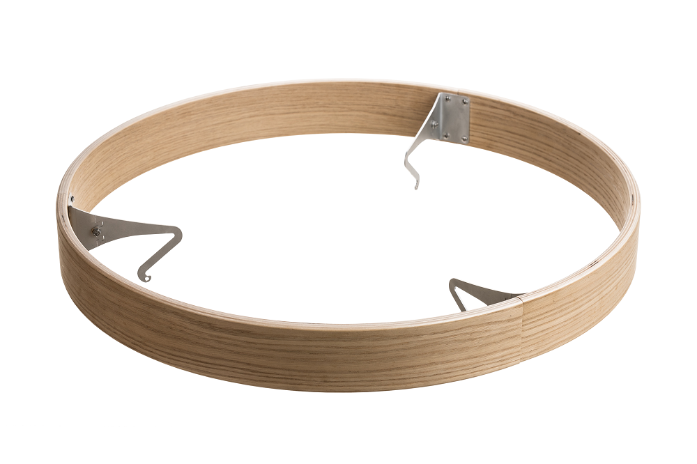 De ring is gemaakt van een lichtgekleurde houtsoort en roestvrijstalen onderdelen.